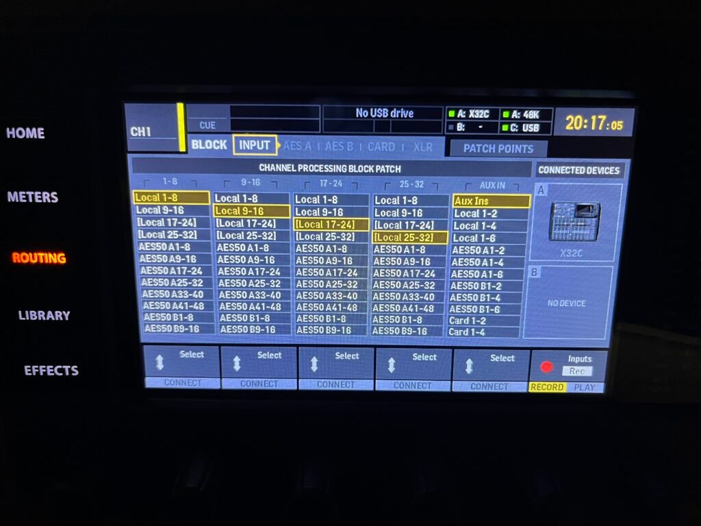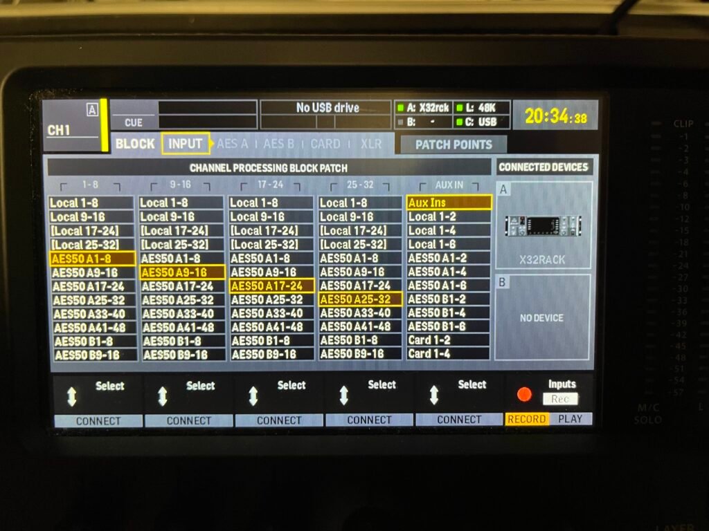• Routing tab: Input 1 – 32 > AES A 1 – 32