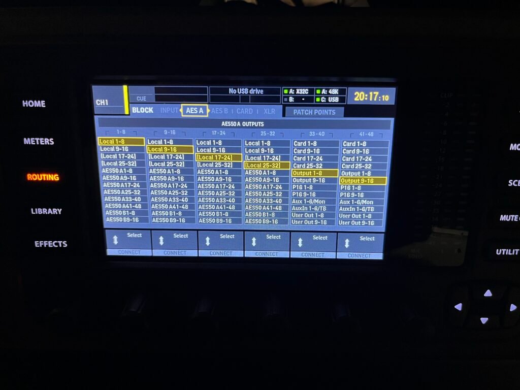 • Routing tab: AES A 33 – 48 > Output 1 – 16